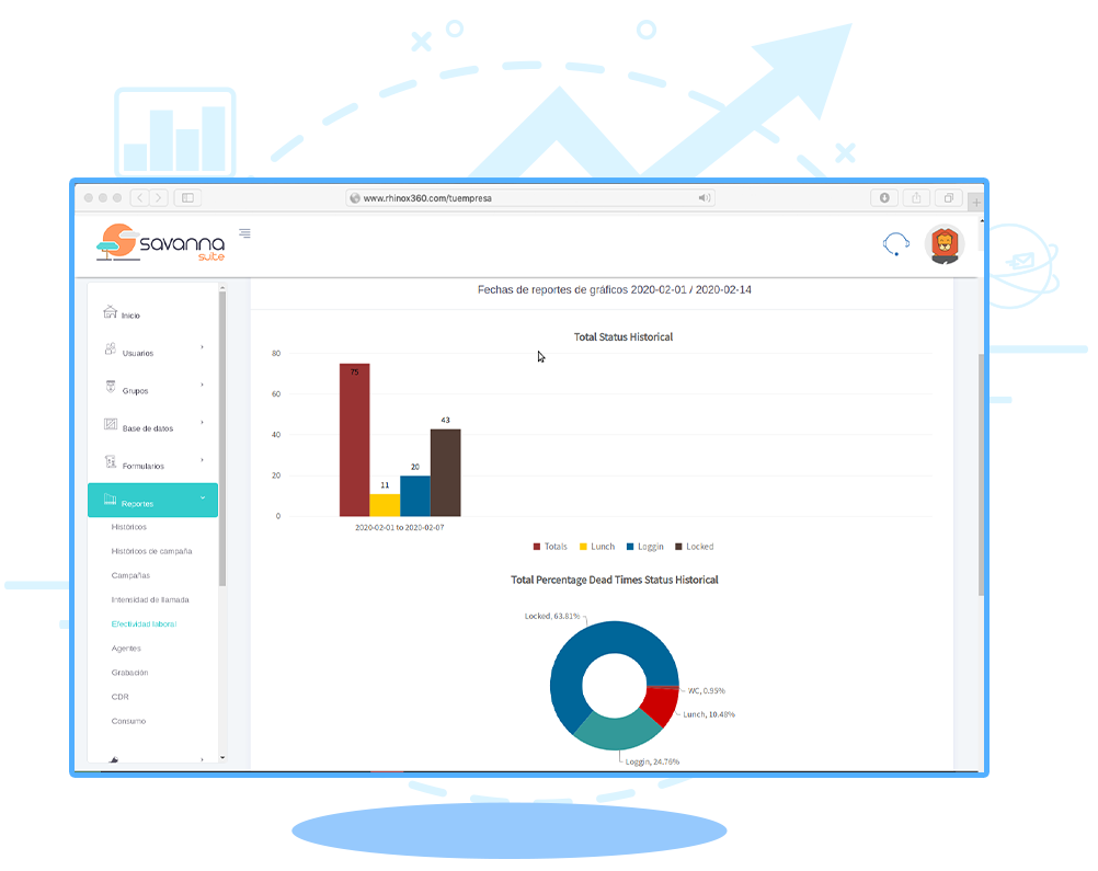 Obtenga múltiples indicadores con unos cuantos clics de toda su operación en tiempo real como tiempos muertos, productividad, consumo y contactación.
